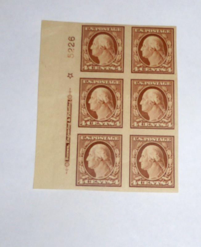 #346 4 cent Washington plate block imperf discoloration on gum scott catalogue value $325