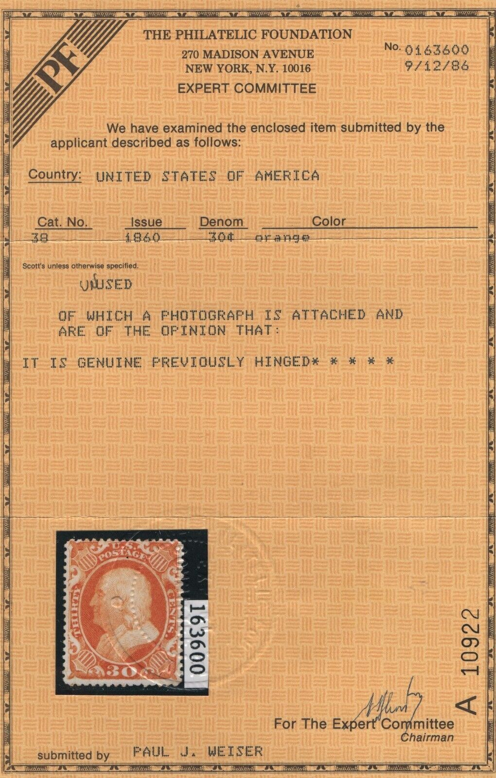 38 VF original gum previously hinged with PF cert nice color ! see pic !