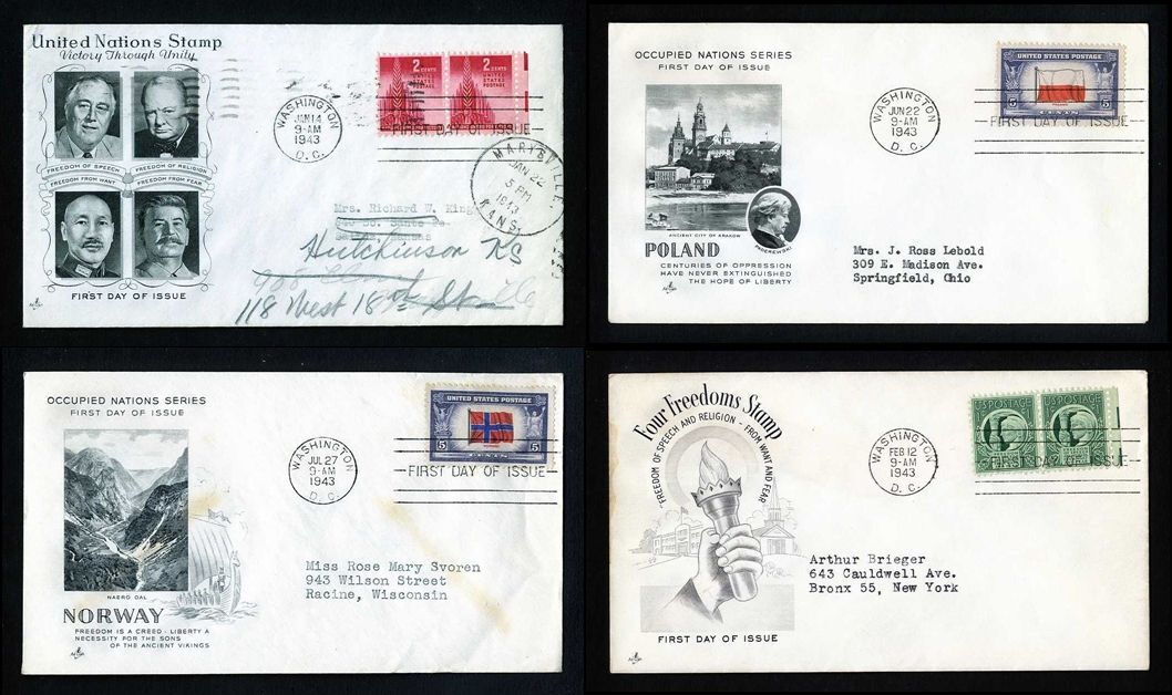 4 Different First Day Covers with cachets dated 1943.MEMBER OF THE APS FOR OVER 30 YEARS.