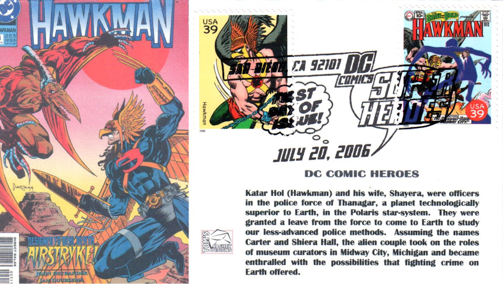 #4084j//t Hawkman - DC Comics Super Heroes first day cover by Tom's Cachet Designs. Postmark State: CA City: San Diego Year: 2006 Month: 7 Day: 20
