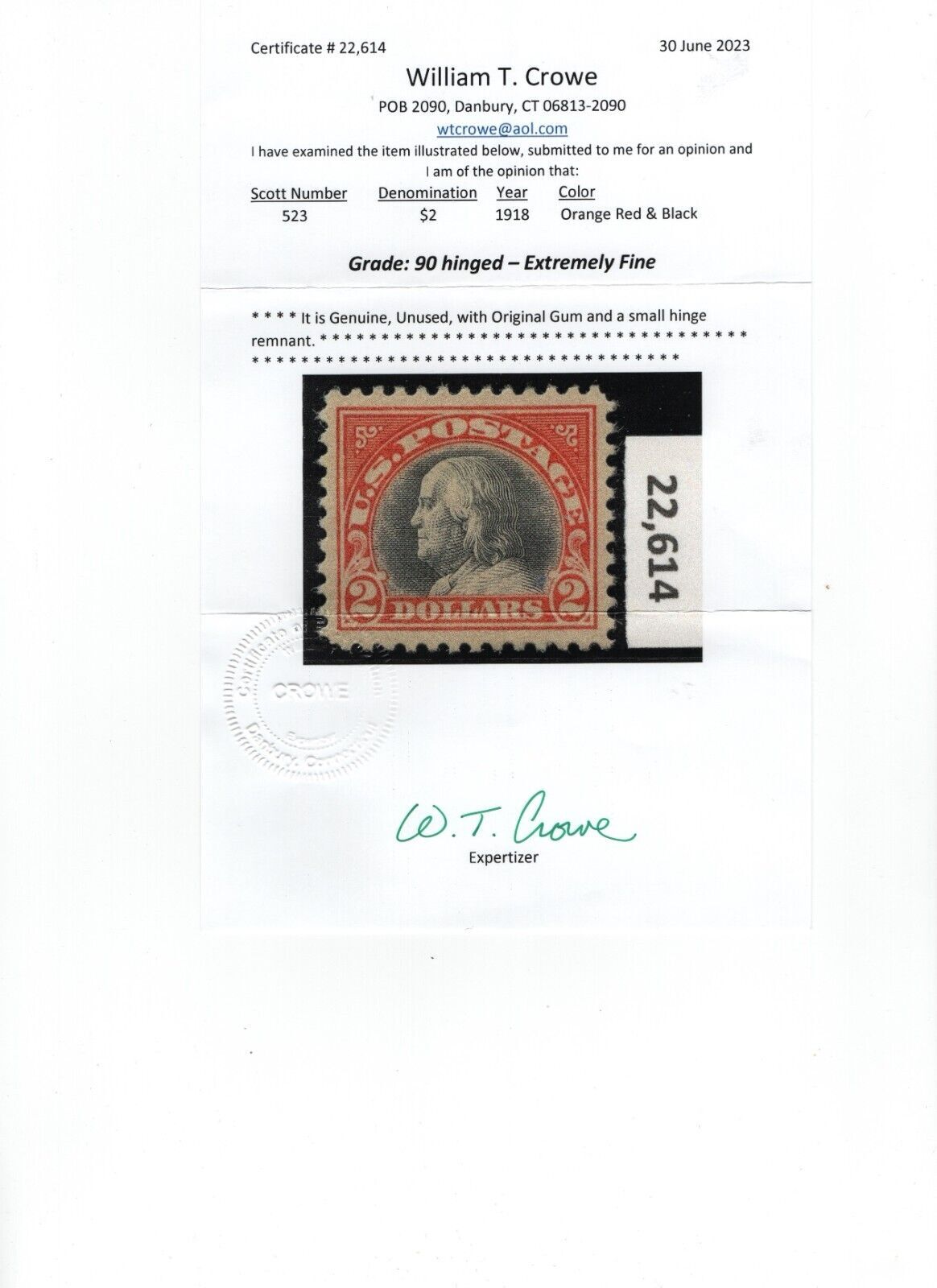 Grade: XF (Extremely Fine)523 Choice - XF original gum mint previously hinged with Crowe certificate graded 90 nice color ! see pic !Buyer pays shipping . $ 3.50 . Foreign shipments add $2.00 additional. paypal accepted. 10 day no questions asked return policy ! Oceanview Stamp Co. , 18685-A Main st. #454 , Huntington Beach, Ca 92648 * Best offer info : Due to the high number of low offers only ONE best offer per item per customer will be considered. Best chances of success are within 85 - 95 % of the Buy it now price - some items cannot be discounted.