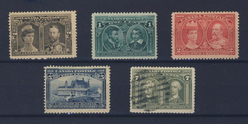 5x Canada 1908 Quebec Tercent. stamps #96-1/2c to #100-7c Guide Value= $180.00