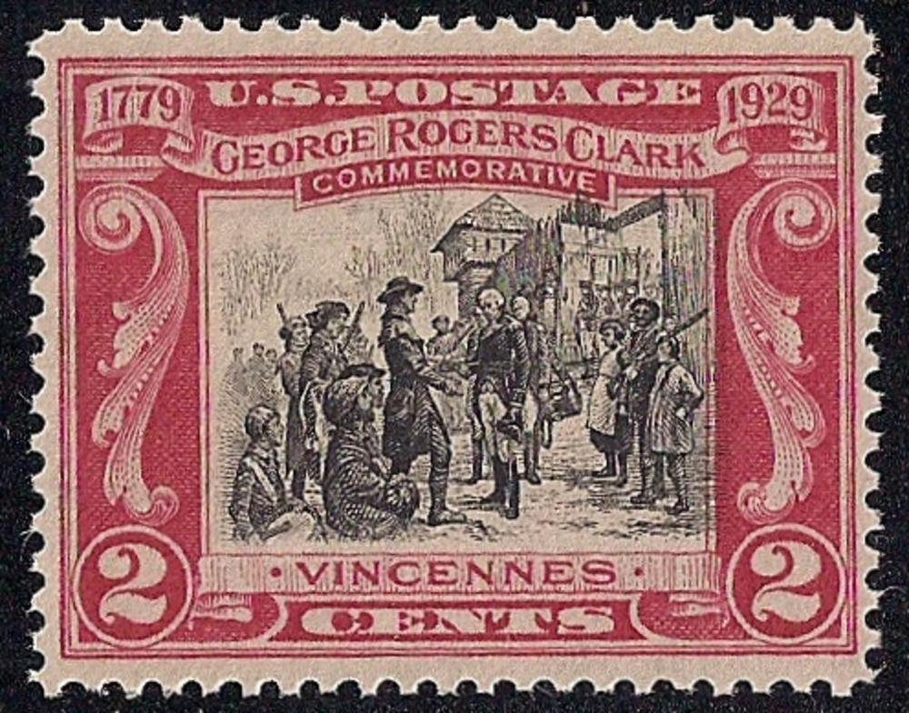 651 2 cent George Rodger Clark, Fort Sackville 150th Anniversary (1928) Stamp mint OG NH XXF deep rich color very nice stamp. Carmine & Black