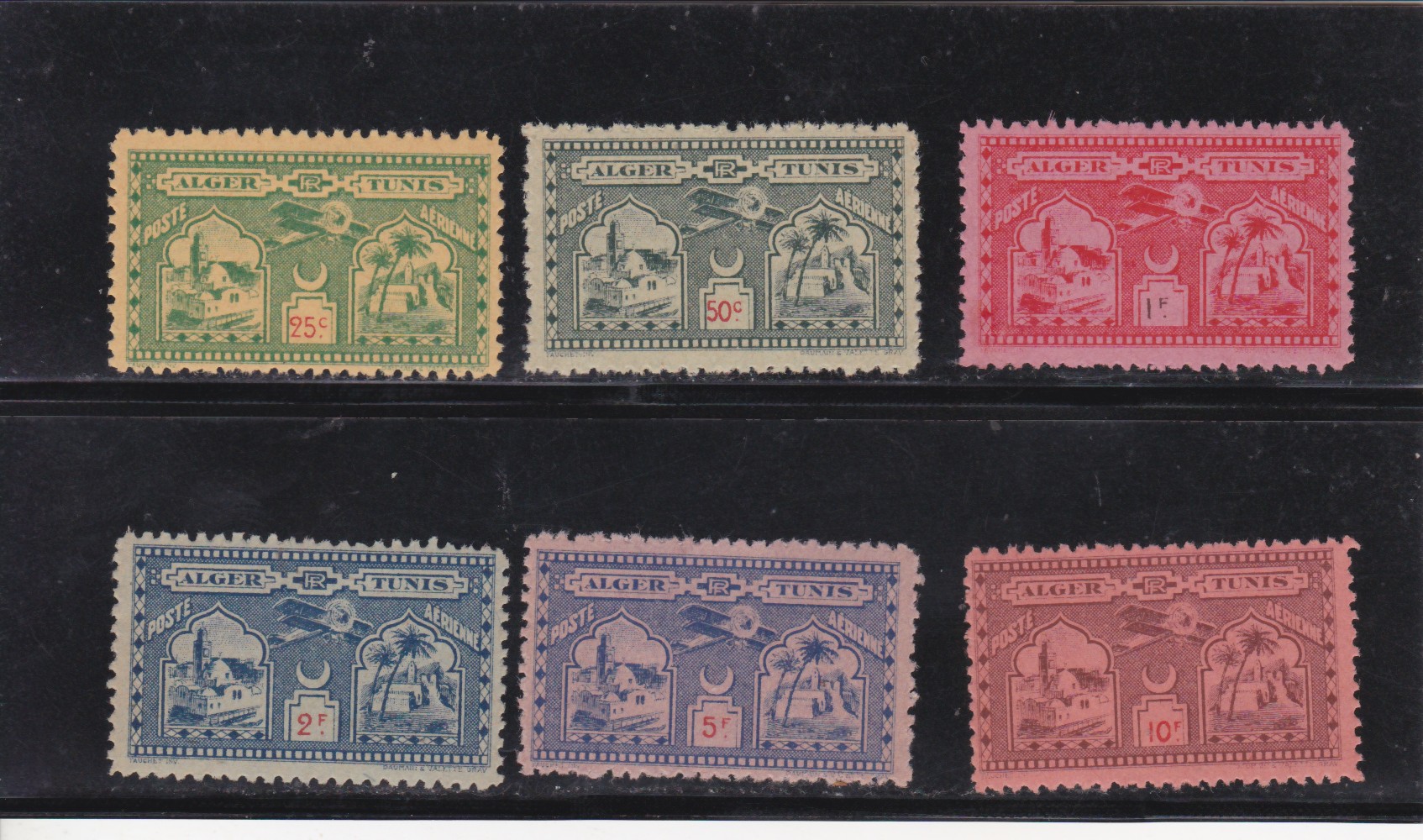 "Listed in Sanabria as S1 to S6. This semi-offical set from Algeria was issued for use on May 15, 1930. It was issued to commemorate the centenary of Algeria's annexation by the French. Designed by M. Fauschet, printed on tinted paper in sheets of 10 x 10 and perforated 11. The inscription at the top is ALGER - TUNIS. There was another similar set printed with the top inscription TUNIS - ALGER. That set was printed, but never released for issue."