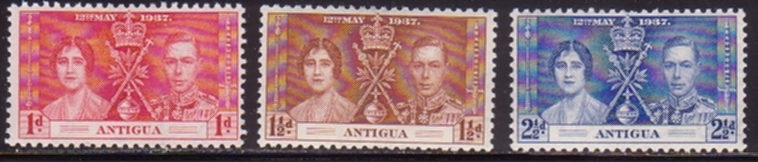 Antigua, Scott #81-83, 1937 Coronation issues in Mint Hinge Remnant condition.Scott 2026 Catalogue Value $1.85