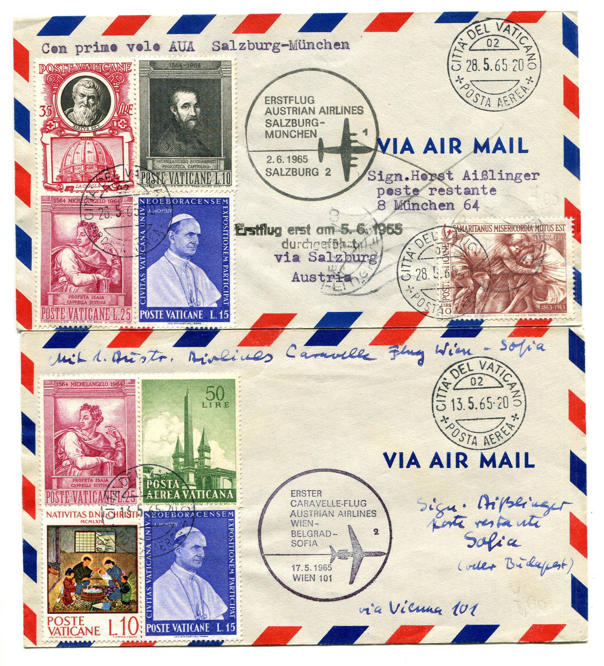 - AUA first flight - Two airograms shipped from the Vatican to Sofia and Munich forwarded with I respectively? flight Vienna/Sofia of 17.5.65 and Salzburg/Munich of 2.6.65 - year. special no. 1365/A What we propose ... Read More
