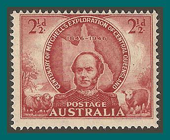 Single stamp from set honouring Sir Thomas Mitchell on the centenary of his exploration of central Queensland. The design shows him, a map of Queensland, cattle and sheep. The stamp is shown in the scan.