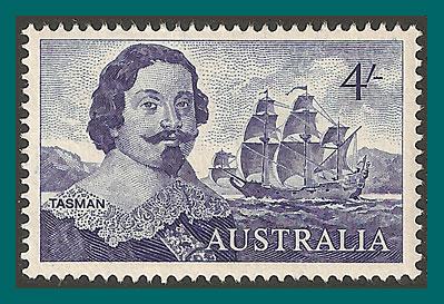 Single stamp, with light hinge mark, from set featuring navigators and showing Abel Tasman and ship 'Heemskerk'.The scan is an example of the stamp you will receive.
