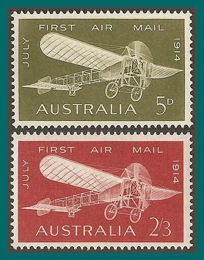 (SG 370 371; Sc 382 383) Full set of stamps celebrating 50th anniversary of first airmail service and showing Bleriot XI monoplane as flown by Maurice Guillaux in 1914.The scan is an example of the set you will receive.