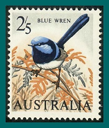 (SG 367; Sc 371) Single stamp from set featuring birds and showing blue wren, on white, chalk-surfaced paper.The scan is an example of the stamp you will receive.