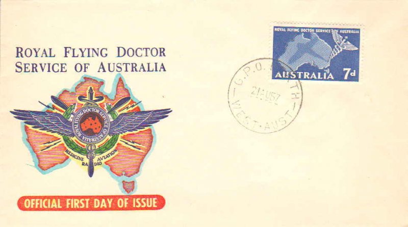 7d Flying Doctor Service 1957 G.P.O. Perth, West-Aust. First Day. Lyle cachet. Unaddressed.Seller Information
