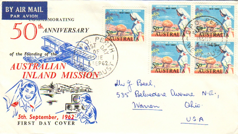5d Inland Mission Block plus single 1962 G.P.O. Perth, West-Aust First Day of Issue Airmail to Warren, Ohio. Cacheted. Ink address.