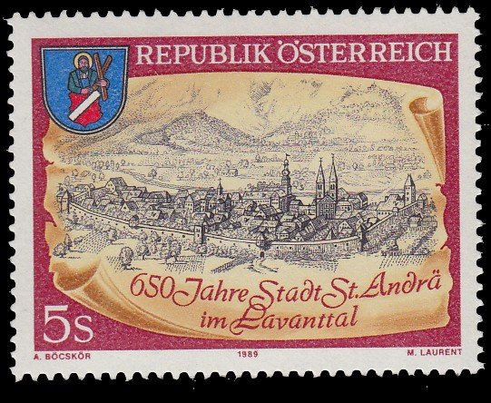 Austria, Scott #1462, 1989 St. Andra im Lavanttal, 650th Anniversary - Period Cityscape by Matthaus Merian issue in Mint Never Hinged condition.Scott 2020 Catalogue Value $0.80