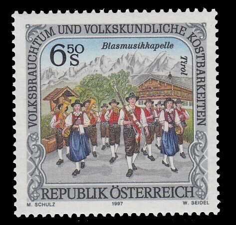 Austria, Scott #1730, 1997 Folklore and Customs - Marching Band, Tyrol issue in Mint Never Hinged condition.Scott 2026 Catalogue Value $0.90