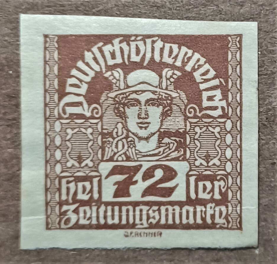 SCV $0.25 (2018). Single 72-heller Mercury newspaper stamp in UNUSED, F-VF condition. Two horizontal creases are seen across the entire width of the stamp, otherwise no flaws noted. No gum. The stamp is firm & its color is bright. Typographed, no gum, no watermark, imperforate.Seller Information
