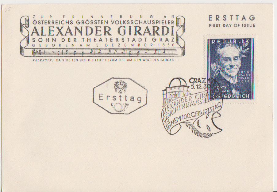 30g Girardi Actor 1950 Graz 5.12.50. Illustrated Postmark Postcard. First Day. Cacheted. Unaddressed.Seller Information