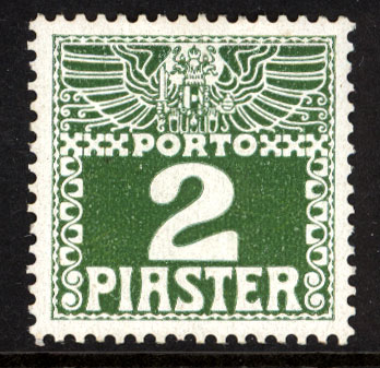 Austria Turkey 1908 Scott #J10a MLH. Dark green, chalky paper. (See Scott's Classic Specialized Catalog for paper varieties.)Available Only to U.S. and Canada.