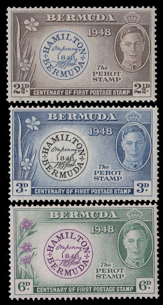 Bermuda, Scott #135-137, 1949 Bermuda's First Postage Stamp, Centenary issues in Mint Never Hinged condition.Scott 2025 Catalogue Value: $0.95