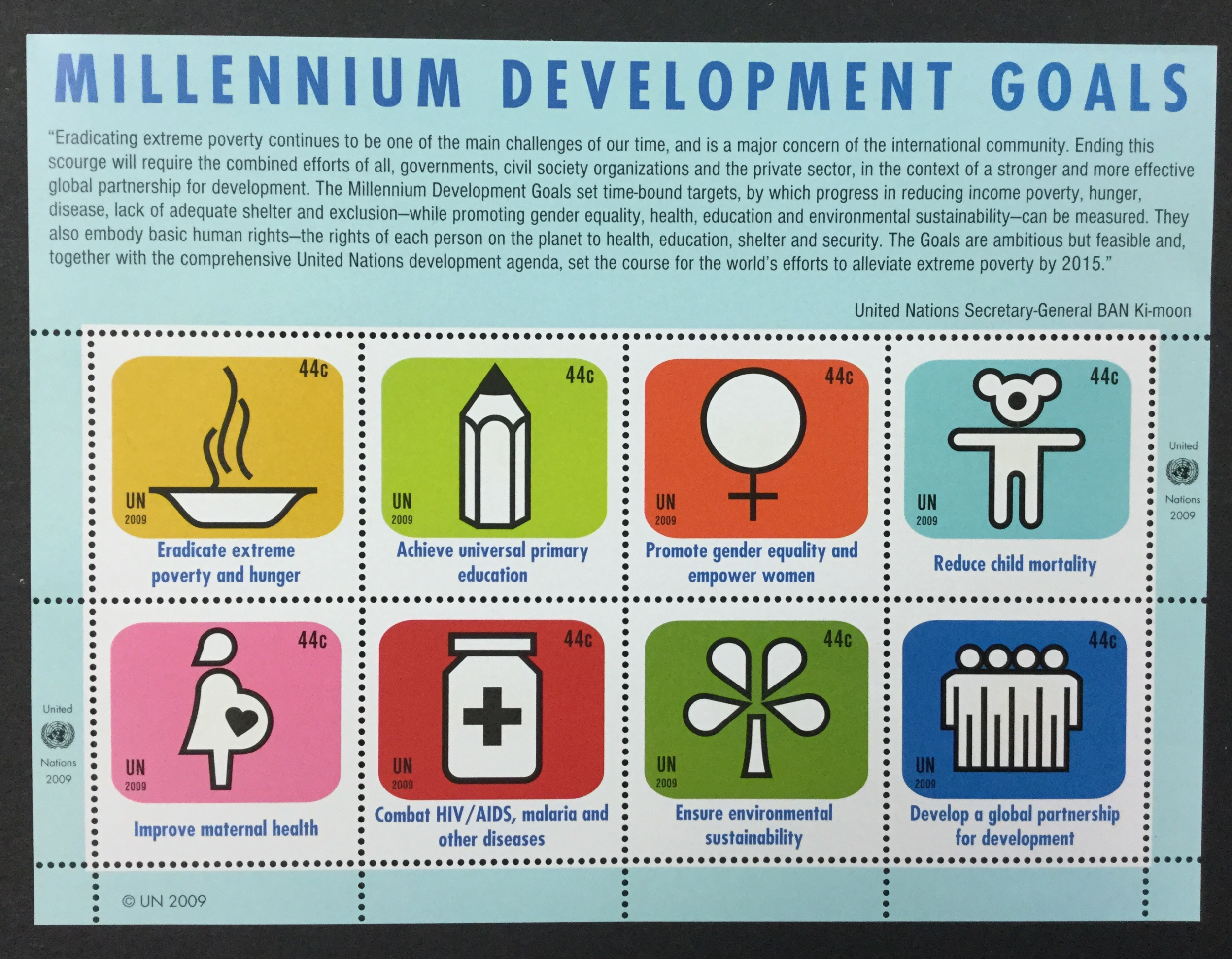 UNITED NATIONS, #995, 2009 sheet of 8 issued for “Millennium Development Goals”. Sheet is VF, OG and Mint Never Hinged. Scott 2018 catalogue value is $10.00.