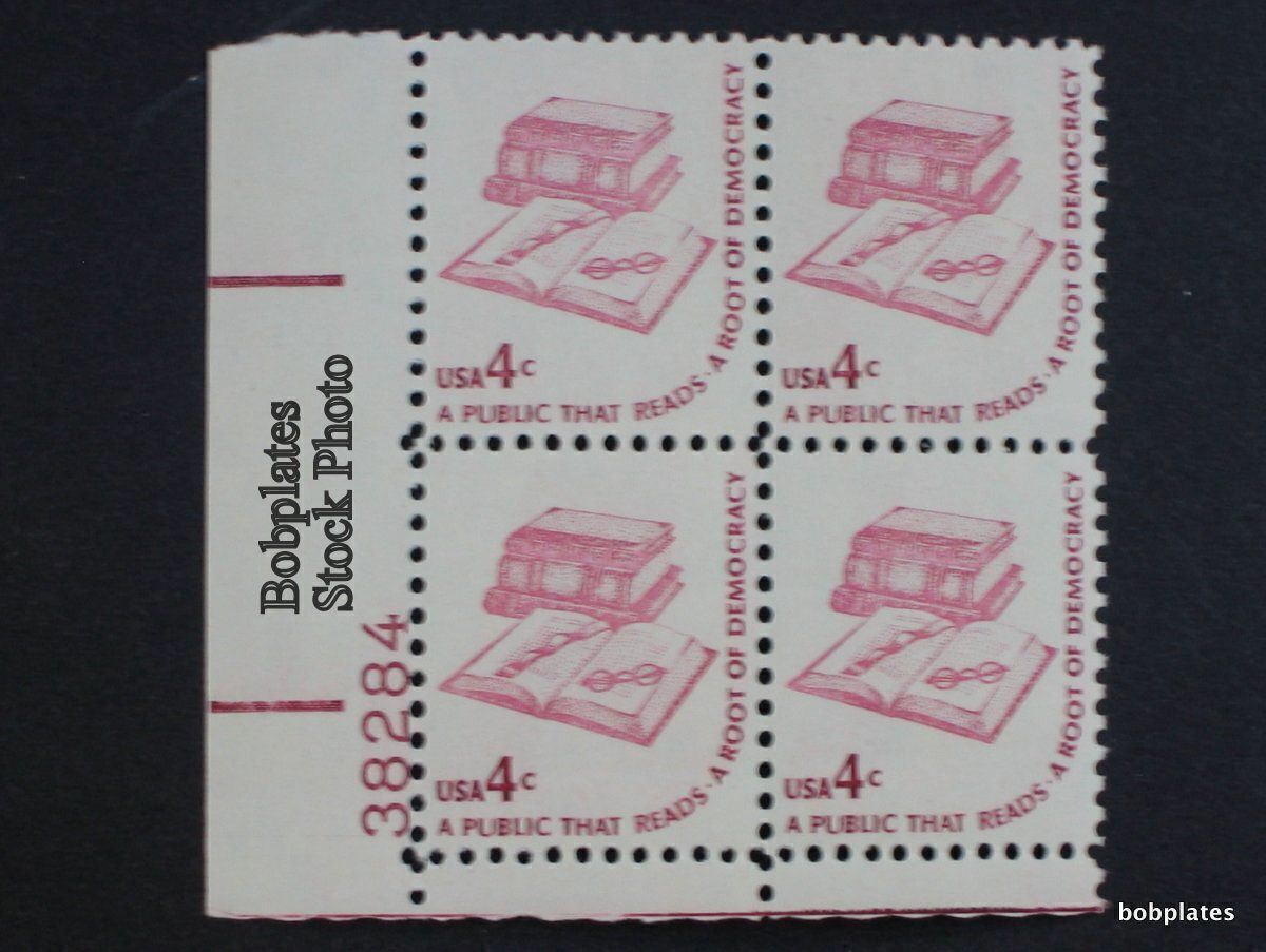 Americana. A Public that Reads. Plate Block of 4. Dull gum. F-VF or BETTER. NH. Post office fresh. Stock photo. 39524 ur 39525 ur 39586 ul Send a hip message with your order indicating which number(2)/po ... Read More
