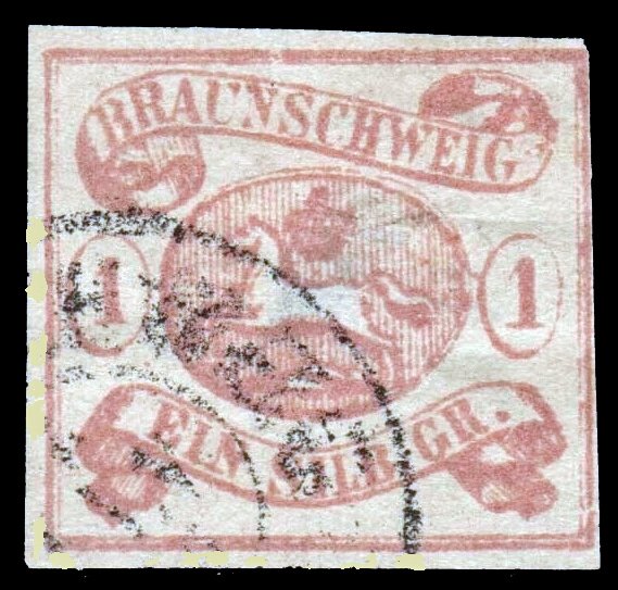 Brunswick was a member of the German Confederation , and in 1870 became part of the German Empire. "The Leaping Saxon Horse." The stamp is a 1sgr rose. The value in the Scotts 2020 catalog is $300.00.Seller Information