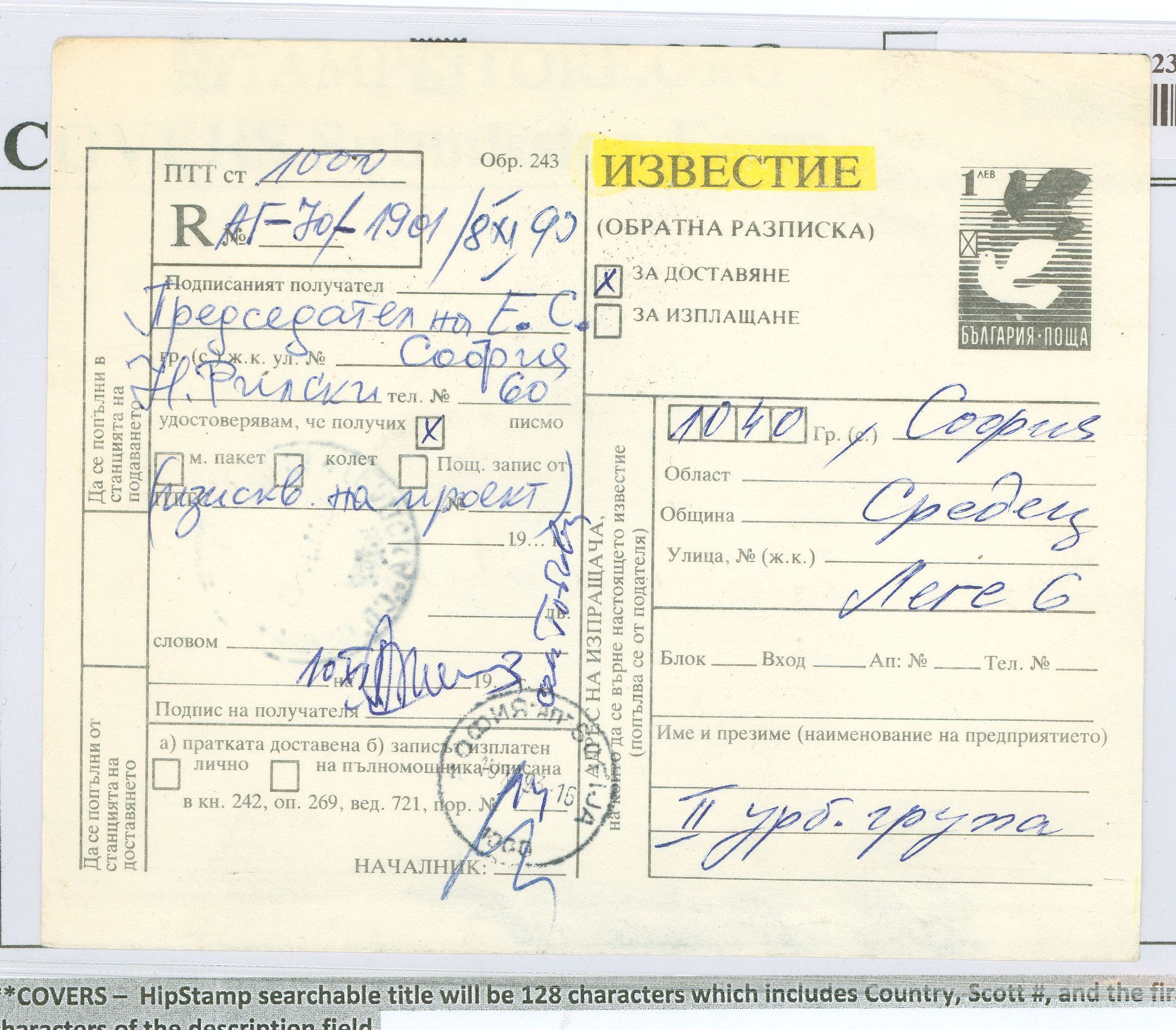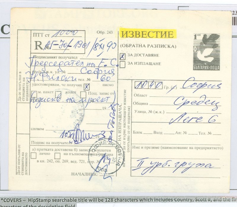 Bulgaria 1 Lev Registry receipt - Sofia.
