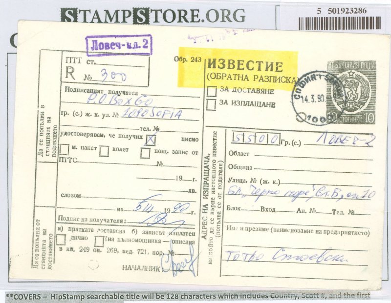 10 Lev Registry receipt. Sofia 1990. APS Stamp Id: 501923286 APS Seller Id: 505869 Hinge Type: Not Specified