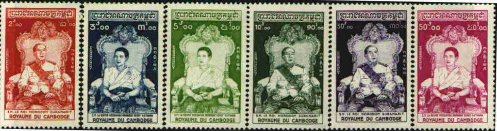 Grade: VF (Very Fine)Cambodia Sc # 53-58 Lightly Hinged Valued @ $ 73.50 Buyer pays $ 1.50 Postage and Handling for N.America or $ 2,50 elsewhere Combining lots to save Postage is acceptableMany other items in my Hip store