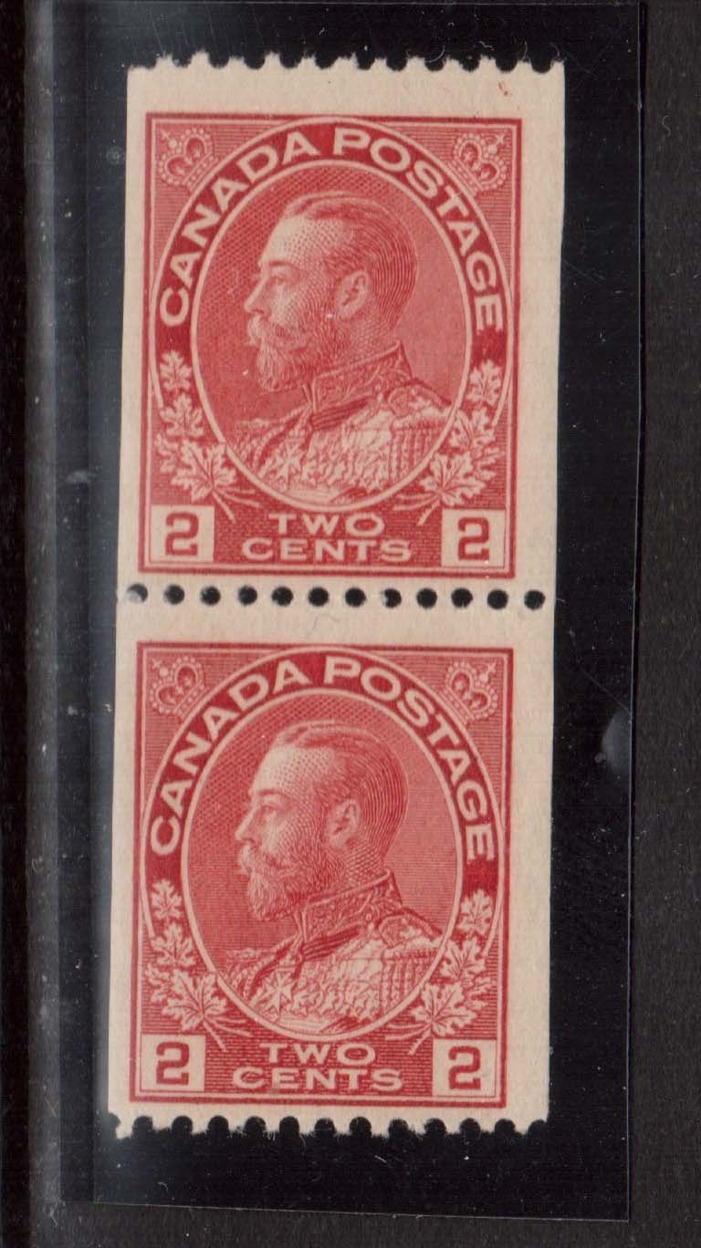 Canada #132 mint fine coil pair, 1 never hinged stamp, 1 lightly hinged stamp.Canadian residents will be charged appropriate taxes for their province.