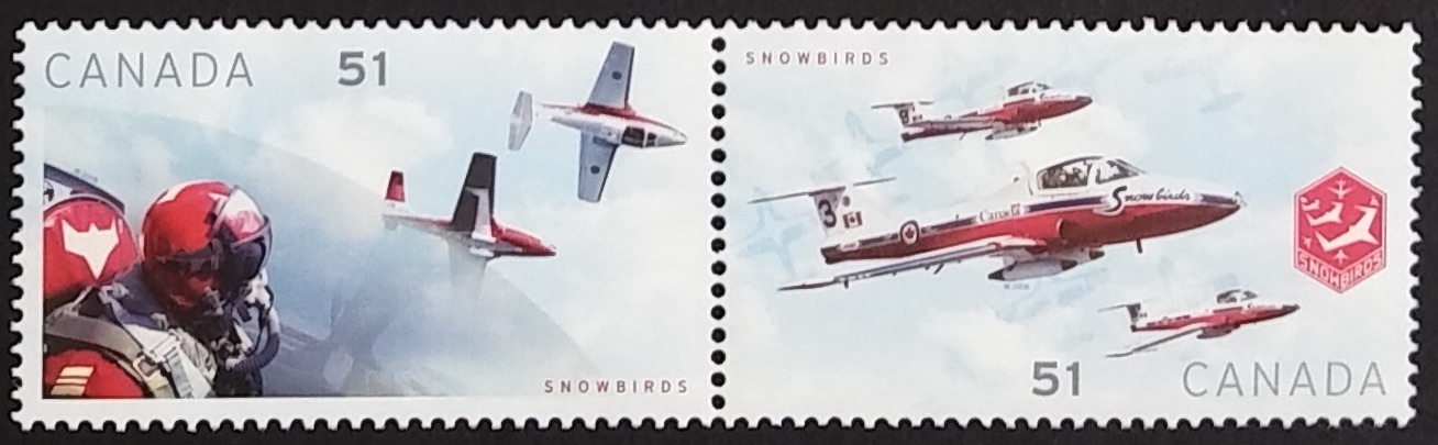 Canadian Forces Snowbirds: Pilot and two planes | 3 planes in front of 9-plane formation.se-tenant pair
