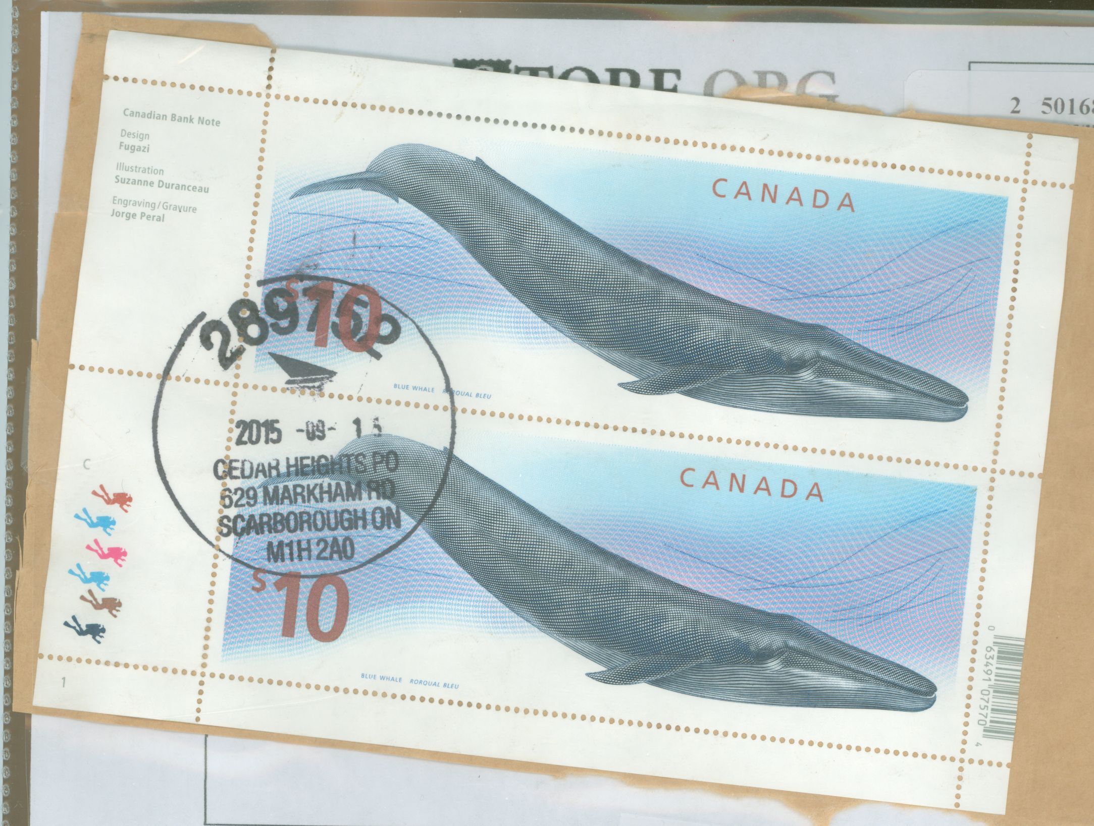 $10 Whale; complete sheet of 2 stamps plus selvage, used on piece. APS Stamp Id: 501689828 APS Seller Id: 608695 Hinge Type: Not Specified
