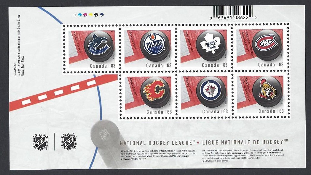 Mint never hinged, souvenir sheet, Canadian NHL team emblems on pucks, issued 2013, (2020 SCV $6.60)