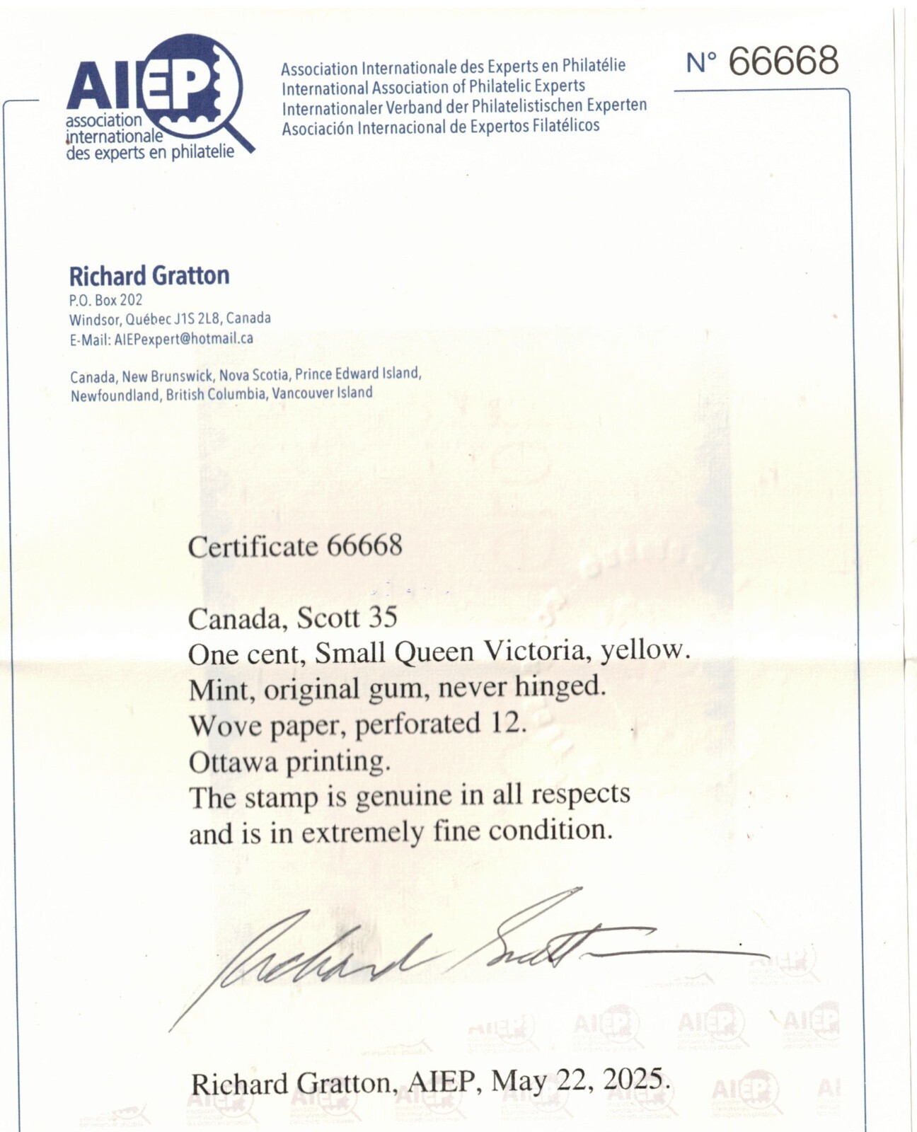 Grade: UngradedCanada #35 Extra Fine Never Hinged Gem, With Certificate. CANADIAN RESIDENTS WILL BE CHARGED APPROPRIATE TAXES FOR THEIR PROVINCE. Shipping Information: Please Add U.S.$2.50 for shipping and handling to USA & Canada. U.S. $3.50 for International orders and U.S.$0.50 for each additional lot. For Oversized Lots (i.e.: Sheets, Large Covers, Etc.) Please Add U.S.$6.00 for shipping and handling to USA & Canada. U.S. $7.00 for International orders and U.S.$0.25 for each additional lot (U.S.$1.00 For Each Additional Oversized Lot). Registered Mail Costs An Additional U.S. $9.00 To Canadian Addresses And An Additional U.S. $13.00 For U.S.A. Or International Addresses. CANADIAN RESIDENTS WILL BE CHARGED APPROPRIATE TAXES FOR THEIR PROVINCE. Payment Instructions: City Stamp Accepts Visa, MasterCard & PayPal. We Accept Canadian Currency At The Current Exchange. .