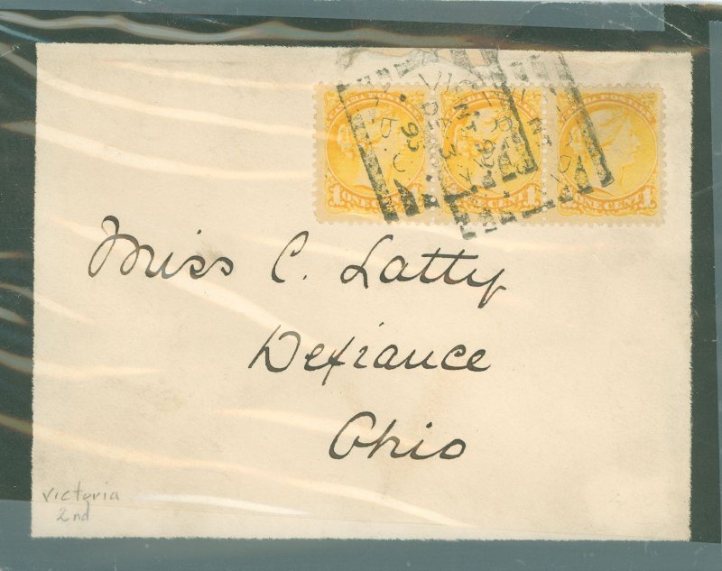 Strip of 3 on mourning cover postmarked Dec 3, 95 to Defiance, Ohio. Back stamped Defiance, Ohio Dec 9, 1895 rec'd. APS Stamp Id: 501888566 APS Seller Id: 623907 Hinge Type: Not Specified