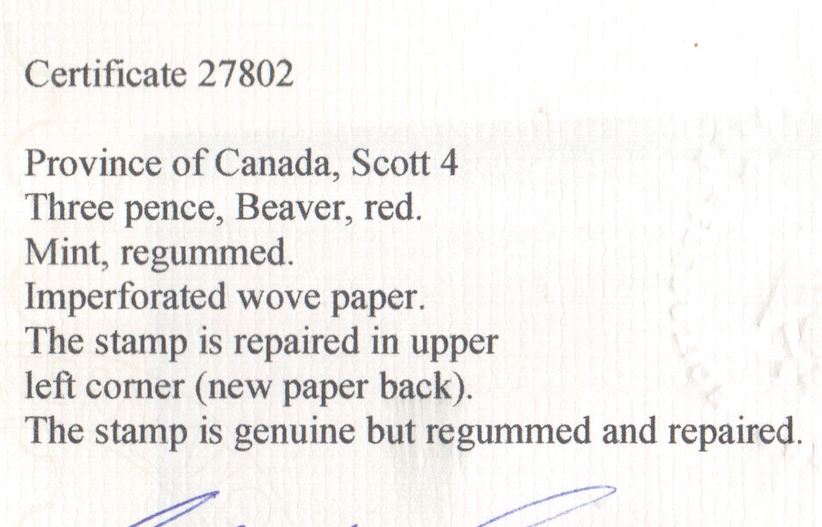 Canada #4 very fine mint, unused (regummed) and hidden repair at upper left, lovely, with certificate.Canadian residents will be charged appropriate taxes for their province.