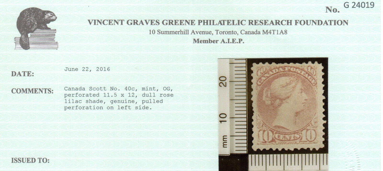Canada #40c very fine mint, full original gum, hinged, perf 11.5 x 12, dull rose lilac, one pulled perf at left side, with certificate.Canadian residents will be charged appropriate taxes for their province.