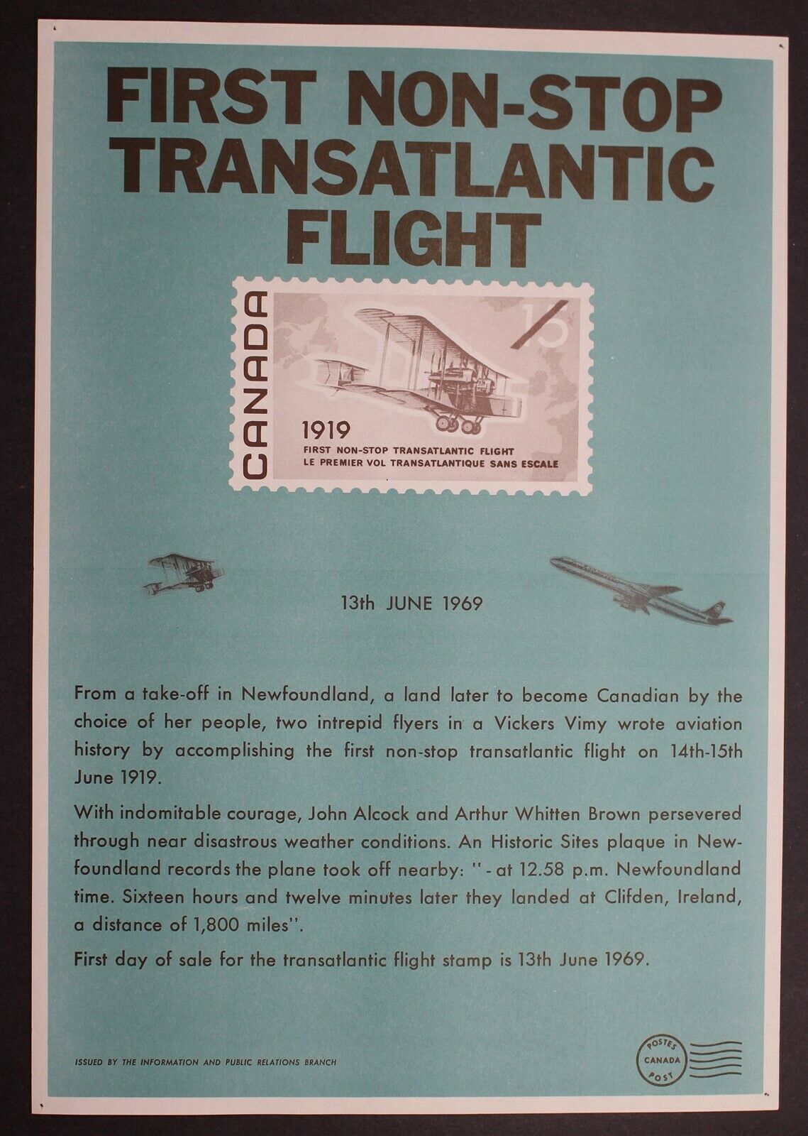Grade: Ungraded CANADA ALCOCK-BROWN FLIGHT #494Vickers Vimy over Atlantic POST OFFICE NEW ISSUE POSTERAPPROXIMATELY 9"x13" *PREVIOUSLY FOLDED IN HALF* *SEE PICTURE FOR CONDITION**SHIPPING: CANADA $2.00, USA $3.00, ... Read More