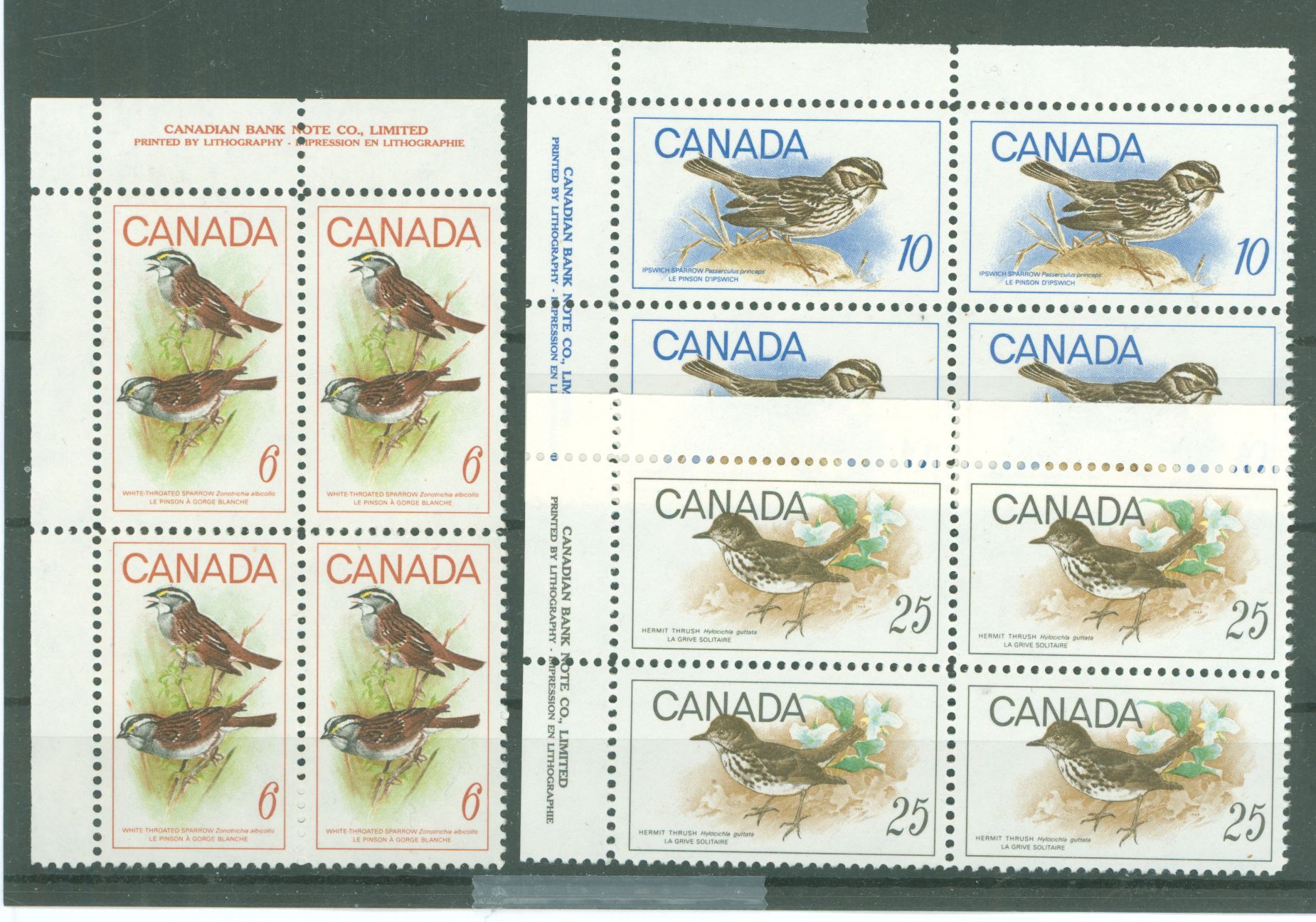 1969 White Throated Sparrow, Ipswich Sparrow, Hermit Thrush, birds; set of MI blocks of 4 APS Stamp Id: 502009980 APS Seller Id: 612224 Hinge Type: NH Other Catalog Name: Brookman