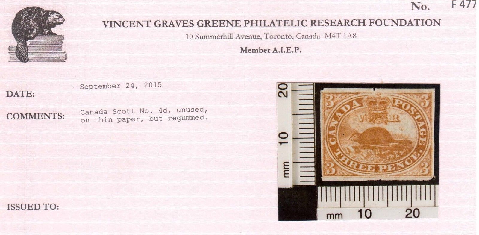 Canada #4d very fine mint, unused (no gum), artfully regummed but sold as no gum, couple of tiny nicks in margins mentioned for the record, with certificate.Canadian residents will be charged appropriate taxes for their province.