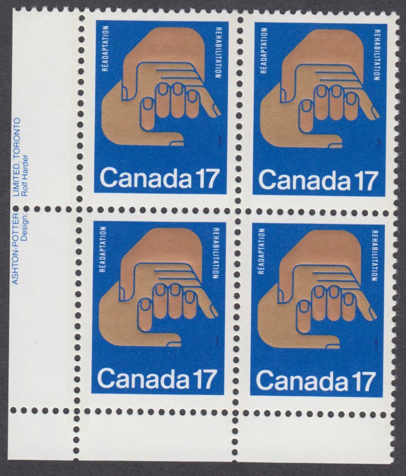 Canada - #856 Helping Hands Plate Block - MNH. Lots may be combined to save on shipping. Money Orders, Cheques and PayPal accepted.