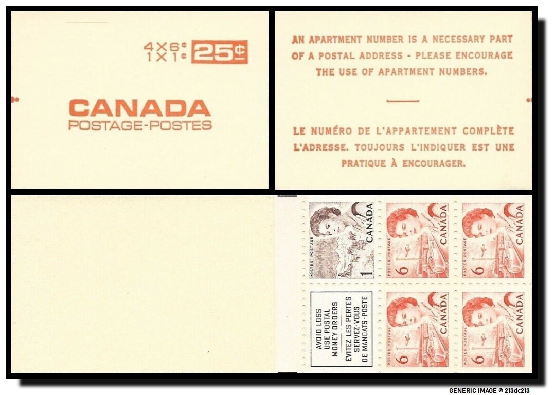 Country Canada #Scott BK59a Pane 454b - 454d x 1 (1¢), 459viii(6¢) x 4 + label (se tenant pane of 5) Issue Centennial Definitives Low Values Name Queen Elizabeth II Date 1968-10 Variety DF, DEX, Colour Browm (1¢), O ... Read More