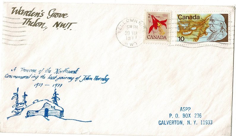 From a collection of covers from the far north of Canada, here is one from 1978: the expedition marked it at Wardens's Grove, Thelon NWT. Postmarked Yellowknife NWT. No marks on backside.