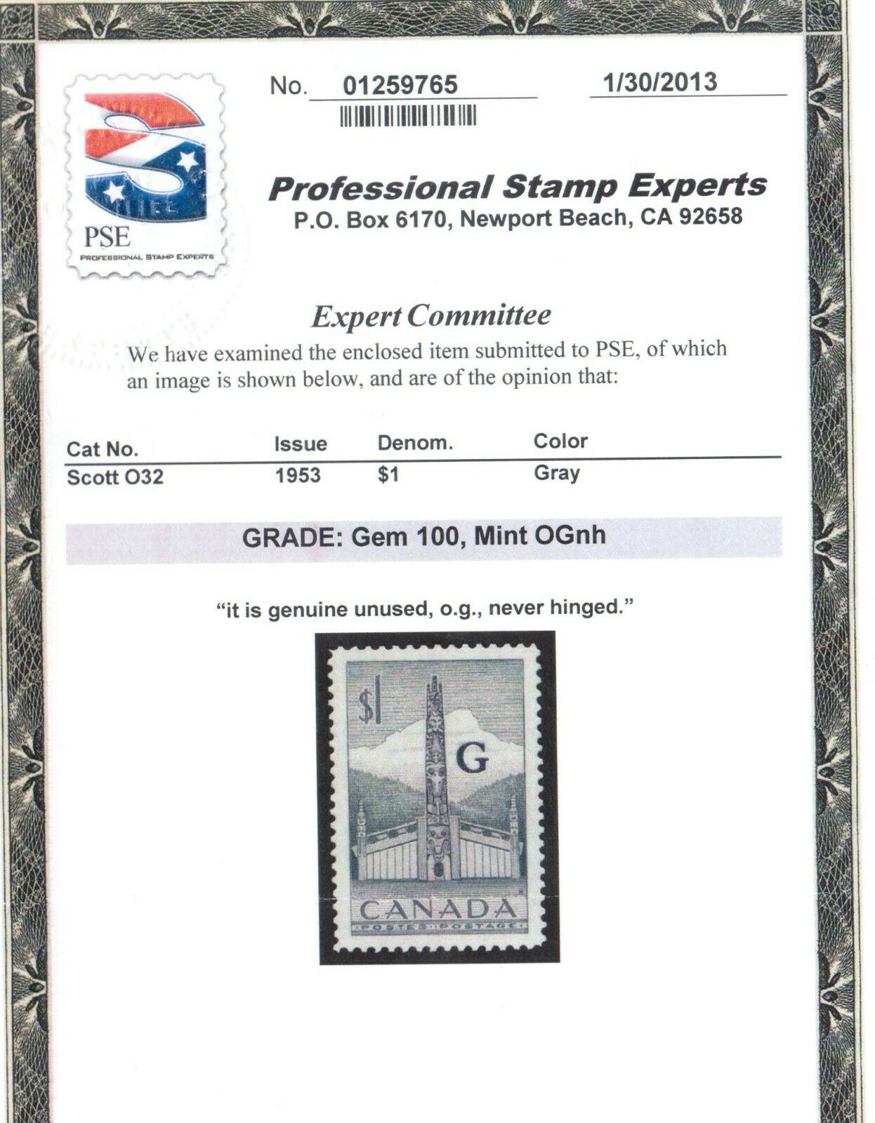 Canada #o32 mint superb never hinged with graded 100 certificate. Canadian residents will be charged appropriate taxes for their province. Shipping Information: Please add u.S.$2.50 for shipping and handling to ... Read More