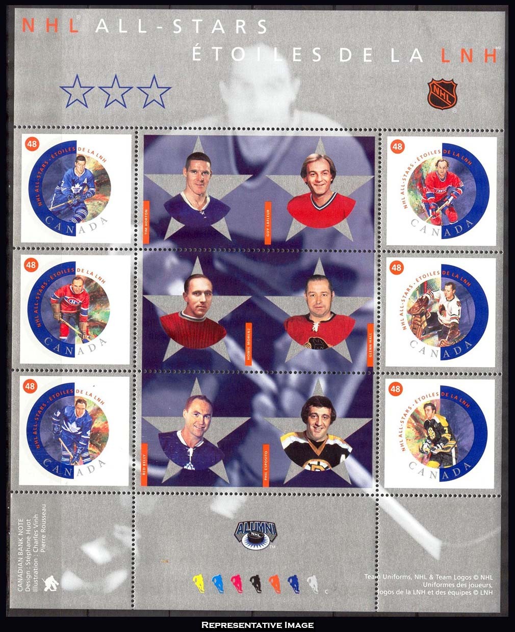 48c, 48c, 48c, 48c, 48c and 48c National Hockey League Stars Se-tenant Pane of six with three labels. Mint never hinged.