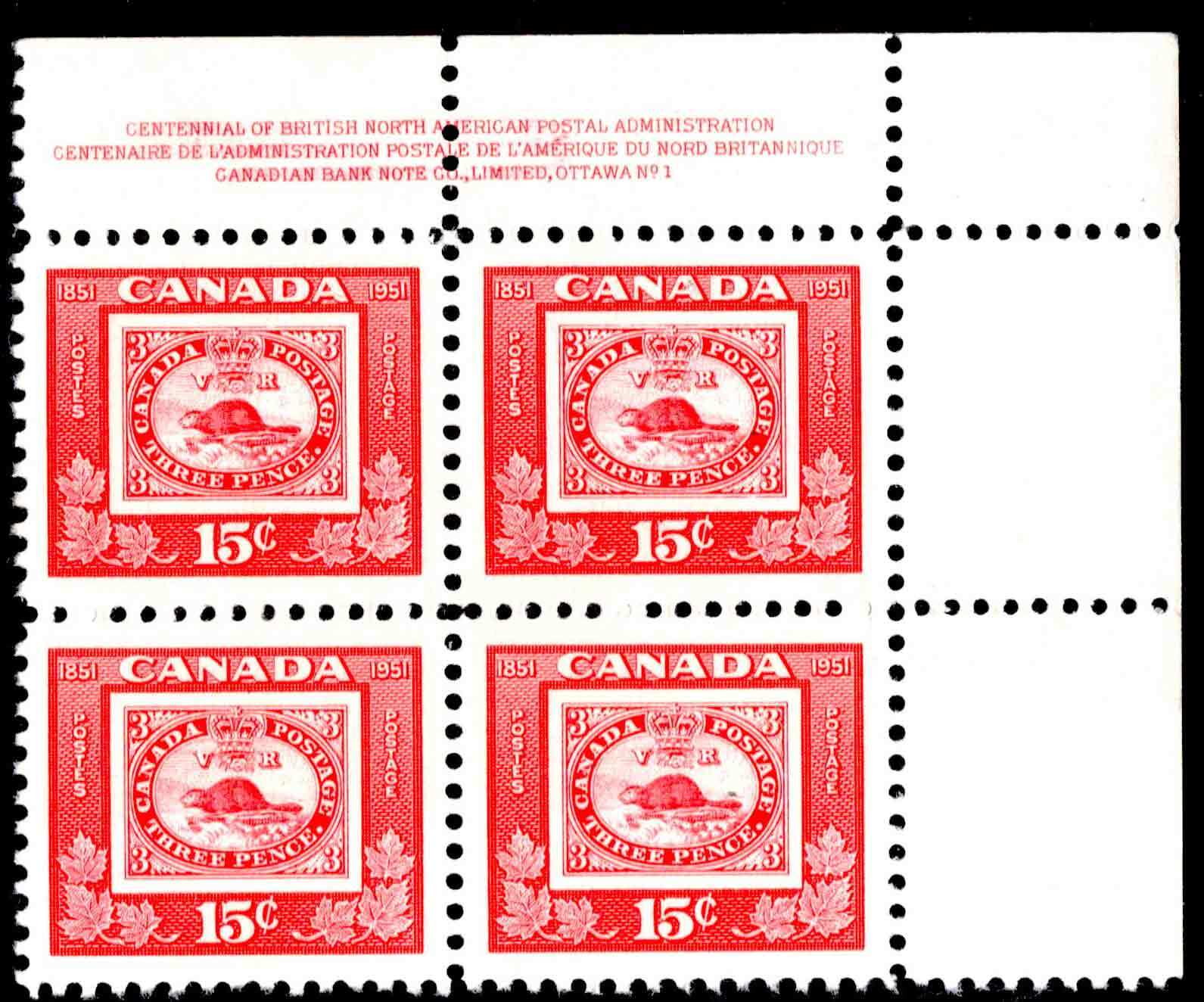 15c Three Penny Beaver CAPEX Plate Block Number 1 Upper Right. Mint never hinged.Seller Information