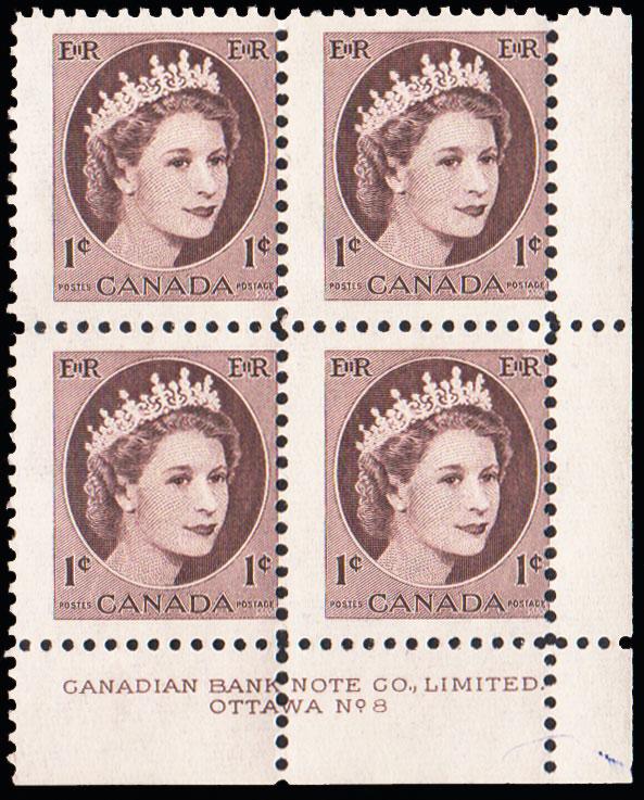 1c QEII Wilding Plate Number 8 Block Lower Right. Mint never hinged.