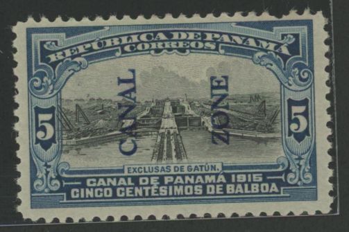1915 5c Gatun locks, blue & blk(Panama 210 w CZ OP type II, blue); well-centered, rich color, sharp tonal contrast; glossy gum (OGHR); SCV: 10.60; pulled perf TR=discountAPS Stamp Id: 501780648