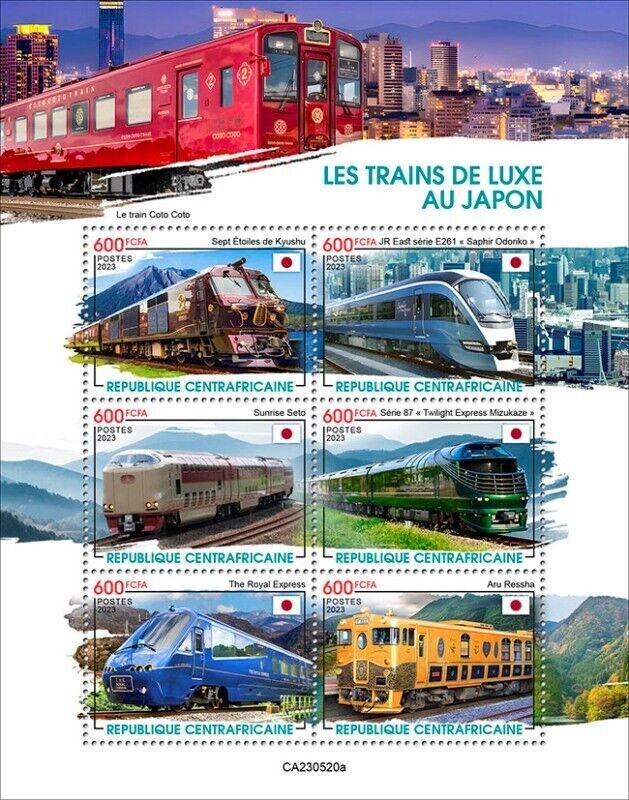 Grade: UngradedCentral Africa - 2023 Luxury Cruise Trains in Japan - 6 Stamp Sheet - CA230520a Country: Central Africa, Year of Issue: 2023, Type: 6 Stamp Sheet, Topic: Luxury Cruise Trains, Japan, Flag, Seven Stars in Kyushu, E261 Series Saphir ODORIKO, Sunrise Seto, Series 87, Twilight Express Mizukaze, Royal Express, Aru Ressha