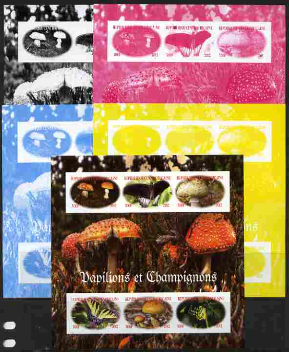 Central African Republic 2012 Mushrooms & Butterflies sheetlet containing 6 values - the set of 5 imperf progressive proofs comprising the 4 individual colours plus all 4-colour composite, unmounted mint