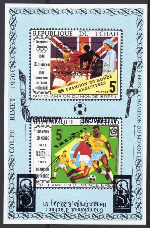 Chad - 1991 - Football World Cup Italy 1990 Germany Winners - Chess Championship in Reggio Emilia 8-20 Jan.1991 - Space - 100th.Years of Football in Italy - 1 Deluxe Souvenir Sheet Imperforated MNH VF Condition - # TCH 1/2DB - INVERTED OVERPRINTED !!!! - MAJOR ERROR - ONLY 3 KNOW WORLD WIDESeller Information